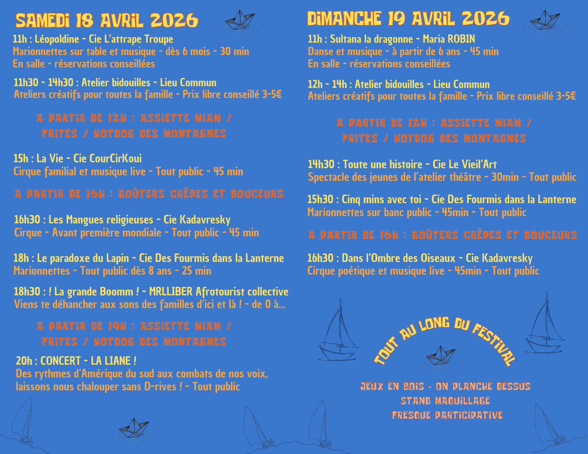 Se croisent alors sur les flots du festival : ateliers de pratiques artistiques, spectacles créés par les enfants mais aussi des spectacles professionnels de cirque, de théâtre, de marionnettes, de danse, des concerts, des jeux en bois, un stand maquillage, des manèges artisanaux, une buvette et une restauration locale, goûters et autres frivolités pour le plaisir des petits…. et aussi des grands !